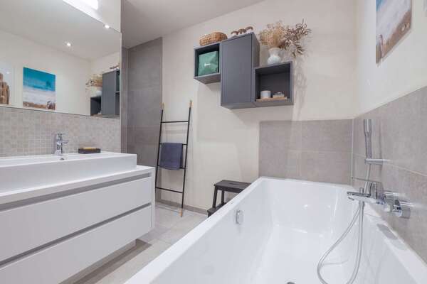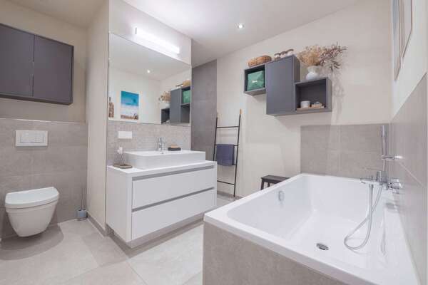 + ein modernes Badezimmer mit Wanne und Dusche